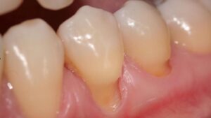 Como o nome diz, é uma perda de estrutura dental na região cervical (o colo ou pescoço do dente) que não é causada por cárie. Visualmente, parece uma cavidade em forma de “V” ou uma concavidade rasa. Durante a avaliação clínica, é um dos sinais que procuramos ativamente. O grande problema dessas lesões é que além da perda de estrutura dental que deixa o dente mais frágil, elas expõem a dentina, a camada interna e mais sensível do dente, causando sensibilidade aguda ao frio, ar ou doces.